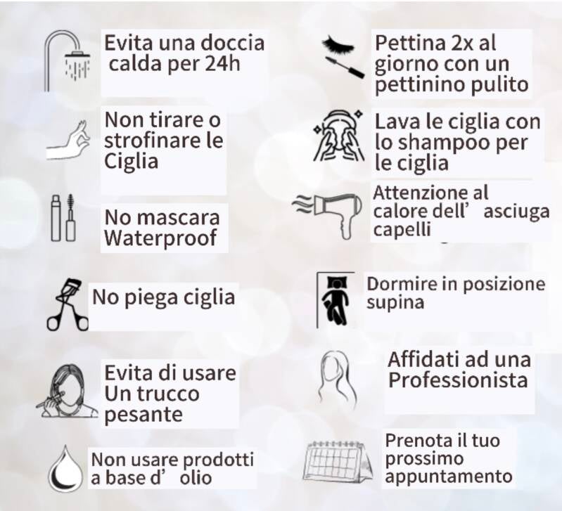 - Evitare di utilizzare mascara waterproof, utilizza il mascara che la lashmaker ti consiglia;